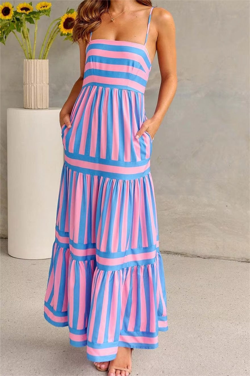 2024 Europe and the United States Simple Elegant Small Fresh Striped Print Leisure Holiday Halter Dress With Halter Pocket