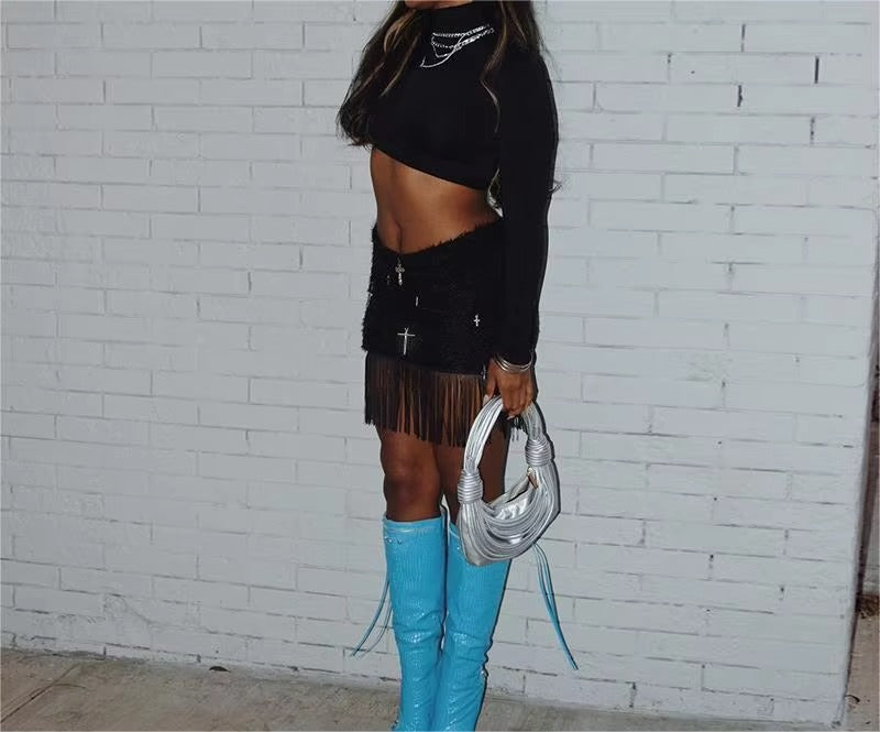 Summer European American Spice Ladies Denim Mini Skirt Casual Cross Fringe Tassel Decor Sexy Black Street Fashion for Women