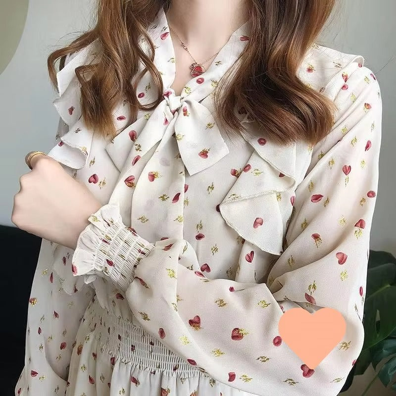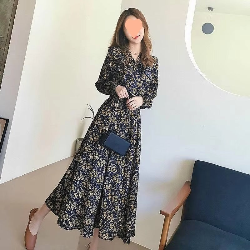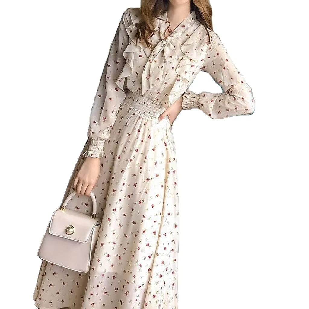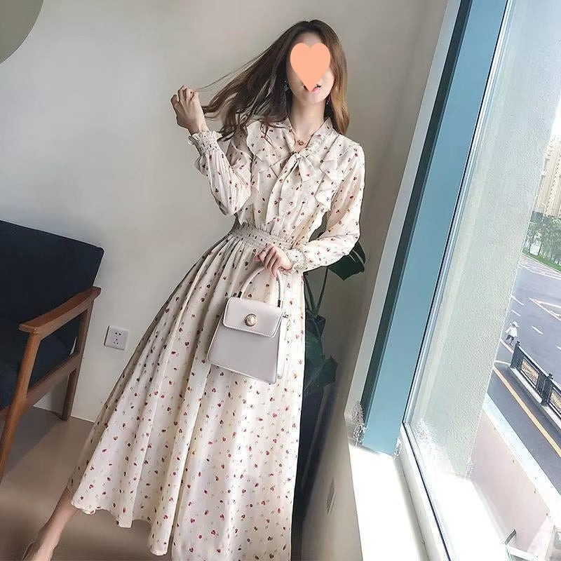 Summer Slim-Fit Chiffon Print Floral Dress for Women Elegant French Fashion With Bow Detail Long Sleeves Leisure Travel Holidays