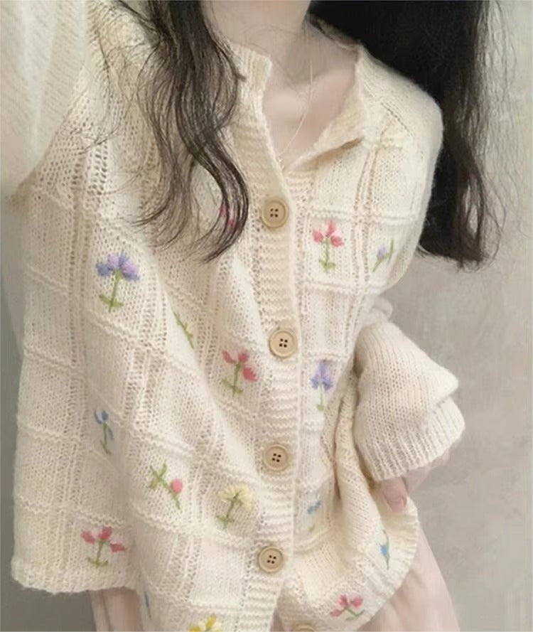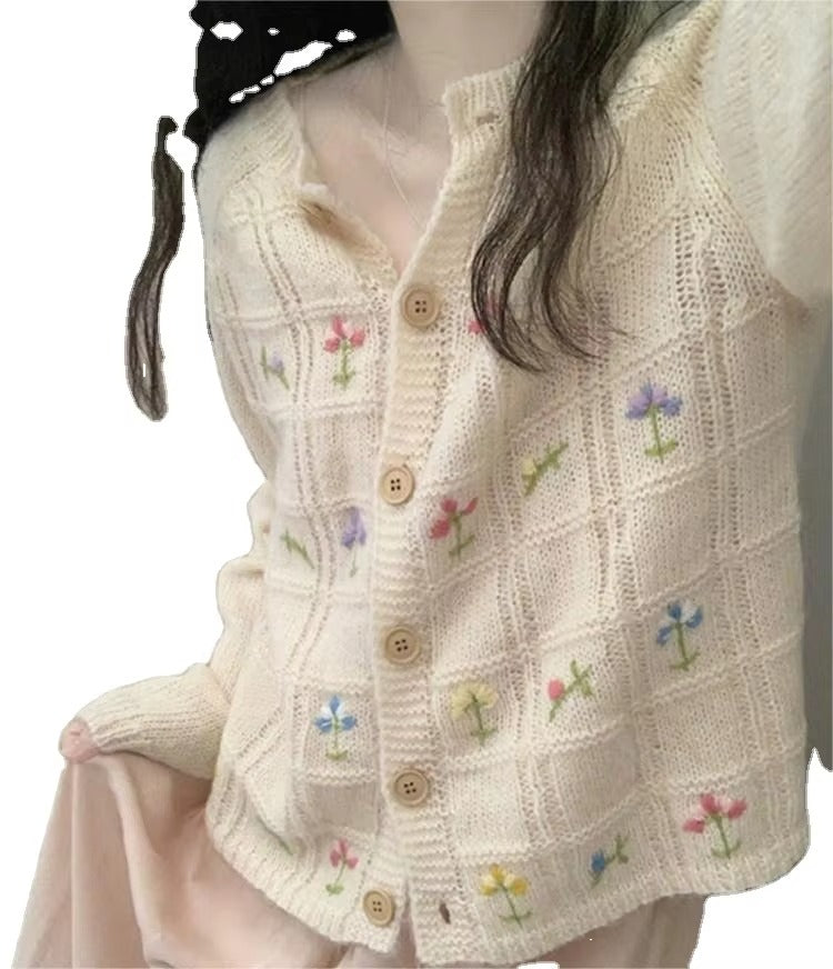 Women's Vintage Autumn Lazy Style Embroidered Sweater - Small Floral Design Long Knitted Cardigan Coat